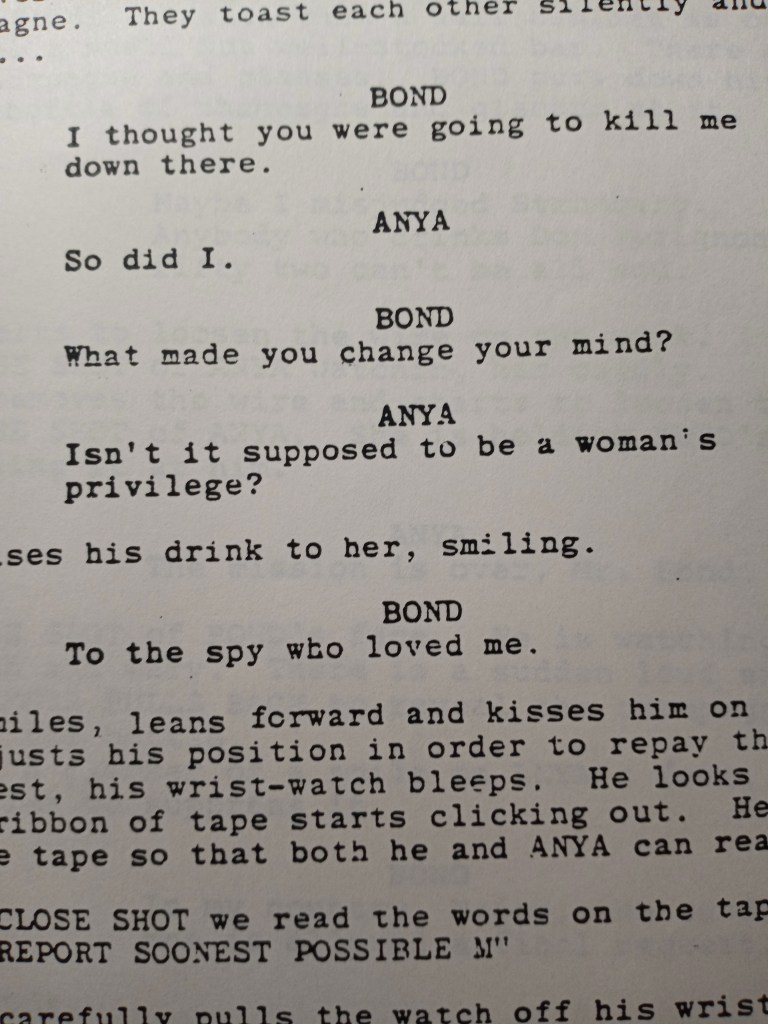However, one very cool bit is in the script that turns Fleming’s original novel on its head! Bond asks Anya why she changed her mind about killing him and she says “Isn’t it supposed to be a woman’s privilege?”