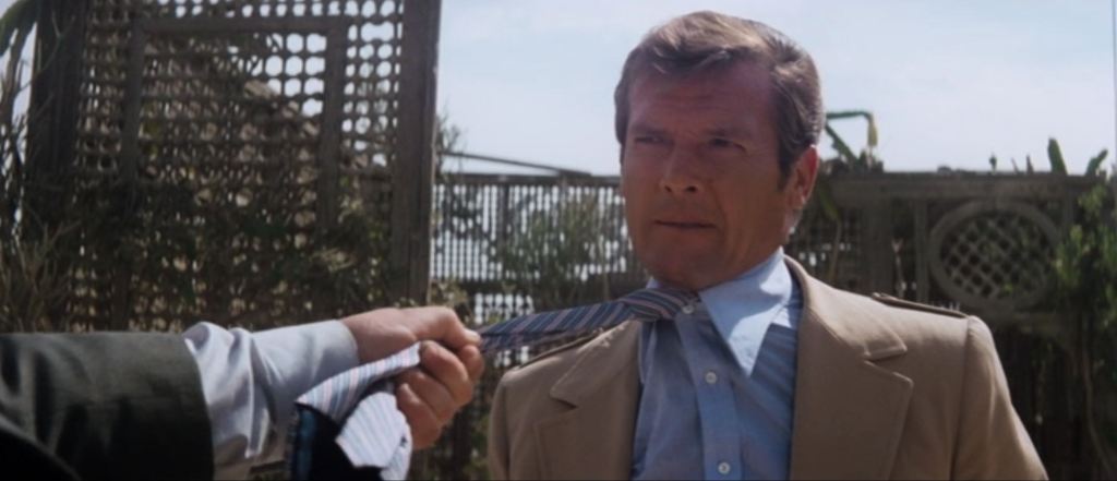 It’s a better bit of staging than in the script and a memorable bit, but why was Moore okay with this but not the “murder” in Eyes Only? Anyway, in the script, when the sleeve rips, Bond says to no one, save the nearby birds, “Not a tailor I’d recommend.”