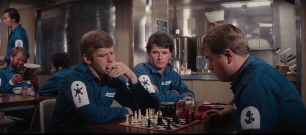In the script, one of the naval crew (Fraser) apparently loses, and the other (Jones) corrects the information on a chalk slate hanging near them to read “JONES 149, FRASER 3” (boy, Fraser is bad!) and then adds “Don’t worry. You got another whole month to find out the Bishop moves diagonally.”