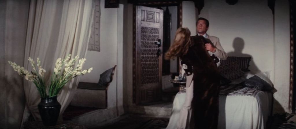 When Bond goes to Fekkesh’s apartment and a woman named Felicca in the script sort of seduces him only to get shot by Sandor, the staging is a little different – in the script Bond tries a bit harder to save them both when the shot is fired – he’s described as “[flinging] her and himself on to the floor beside the divan” where in the movie he either spasmodically or purposefully flings her around to use as a shield to take the bullet – gee, I though Roger Moore was the nice Bond?