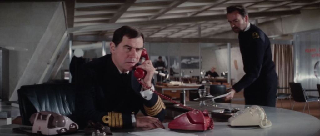 The description of the Submarine Base in the script hints at the fact they were willing to spend money on this one as it is described as a “long room, with big windows, giving an extensive view over the estuary” as opposed to walls covered with maps or something cheaper. Ken Adam comes up with something different that doesn’t provide the view but provides the expensive expansiveness, and all is good.